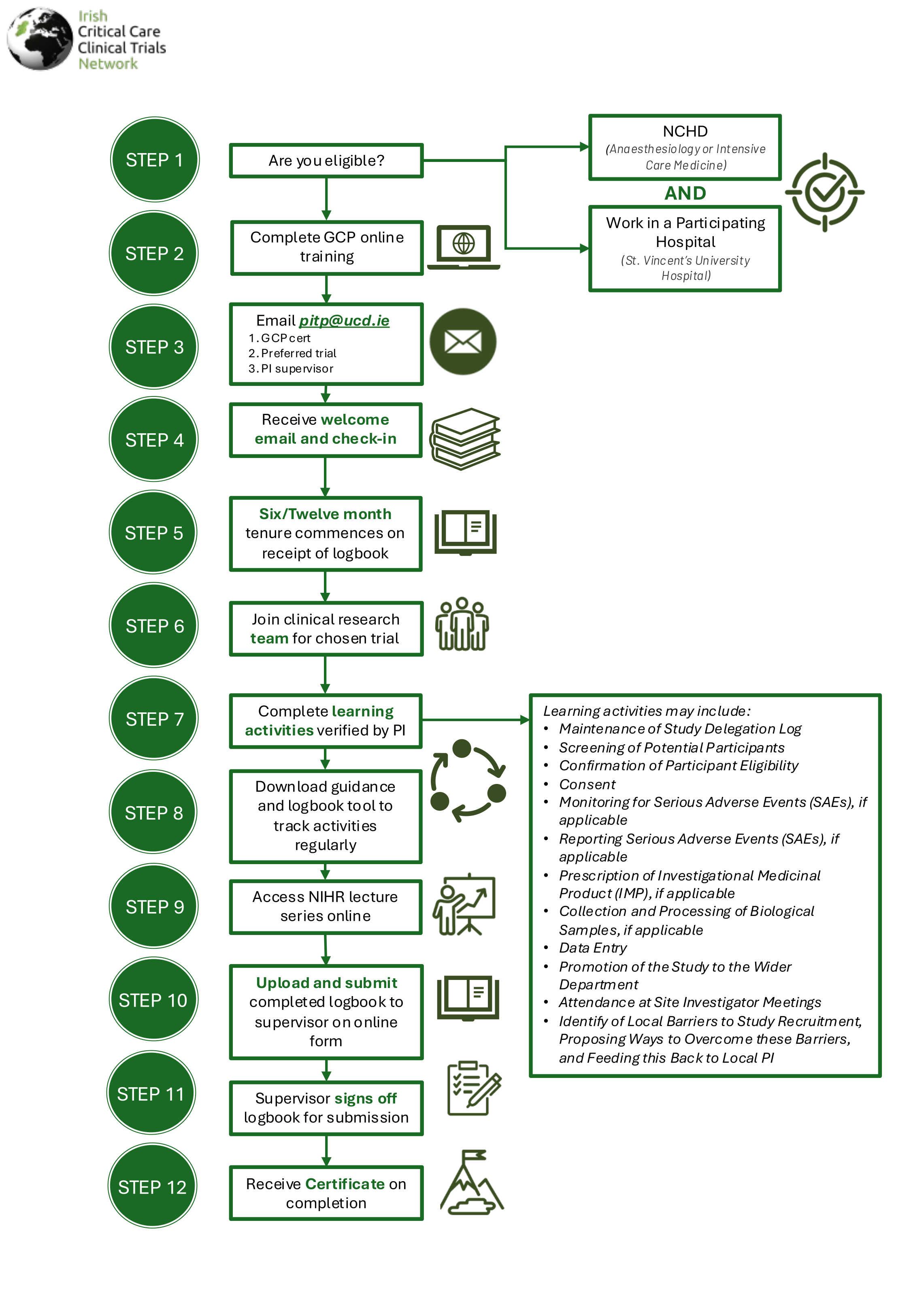 The PITP is a six-month training opportunity that provides practical research experience for NCHDs interested in starting a research career and can be undertaken in parallel with clinical training without significant additional commitment. During the six months, the candidate selects a multicentre clinical trial of interest and is linked with the principal investigator for that trial at their hospital. The candidate becomes an essential member of the clinical research team for that trial and completes a logbook of learning activities that are verified by the principal investigator. On successful completion, a certificate is issued that formally recognises the candidate’s contribution, and the ICC-CTN will recommend to the trial leadership that the candidate is acknowledged in any publications resulting from their work. The candidate will also gain access to a wide variety of educational materials and an online lecture series delivered by the PITP.